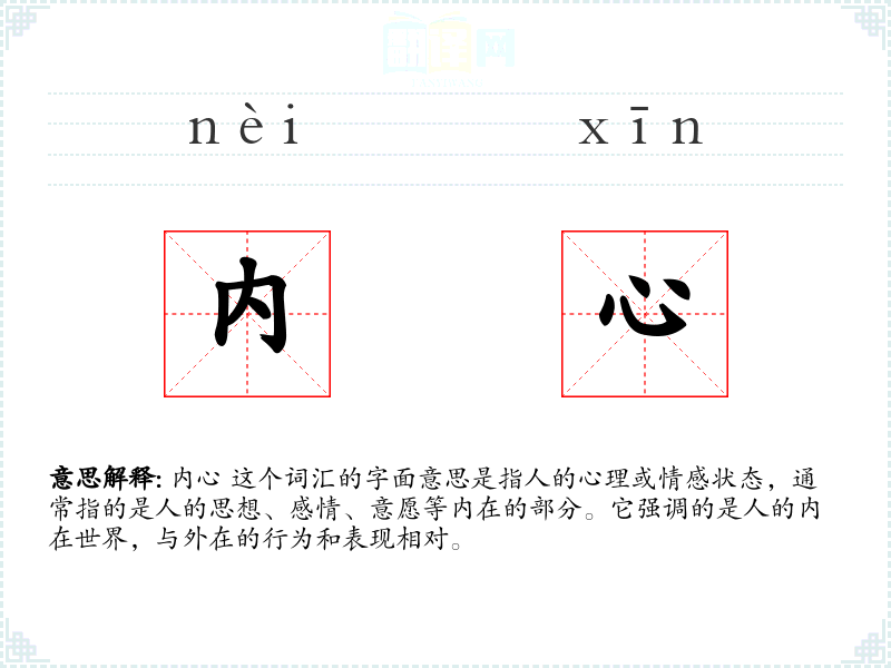 内心 这个词汇的字面意思是指人的心理或情感状态,通常指的是人的思想、感情、意愿等内在的部分。它强调的是人的内在世界,与外在的行为和表现相对。