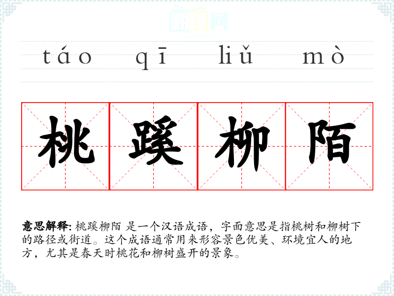 桃蹊柳陌 是一个汉语成语,字面意思是指桃树和柳树下的路径或街道。这个成语通常用来形容景色优美、环境宜人的地方,尤其是春天时桃花和柳树盛开的景象。