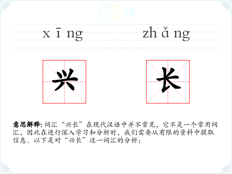 由于“兴长”不是一个常用词汇,关于它的词源和历史演变的信息非常有限。它可能是由“兴”和“长”两个常用词汇组合而成,用来表达一个复合的意义。