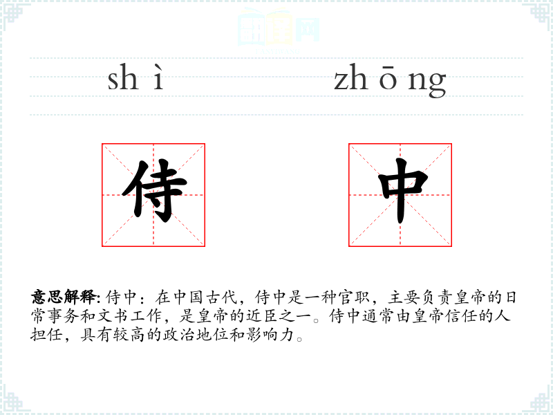侍中:在古代,侍中是一种官职,主要负责的日常事务和文书工作,是的近臣之一。侍中通常由信任的人担任,具有较高的政治地位和影响力。