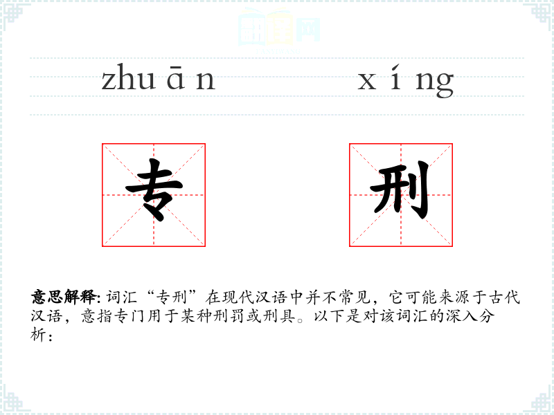 词汇“专刑”在现代汉语中并不常见,它可能来源于古代汉语,意指专门用于某种刑罚或刑具。以下是对该词汇的深入分析: