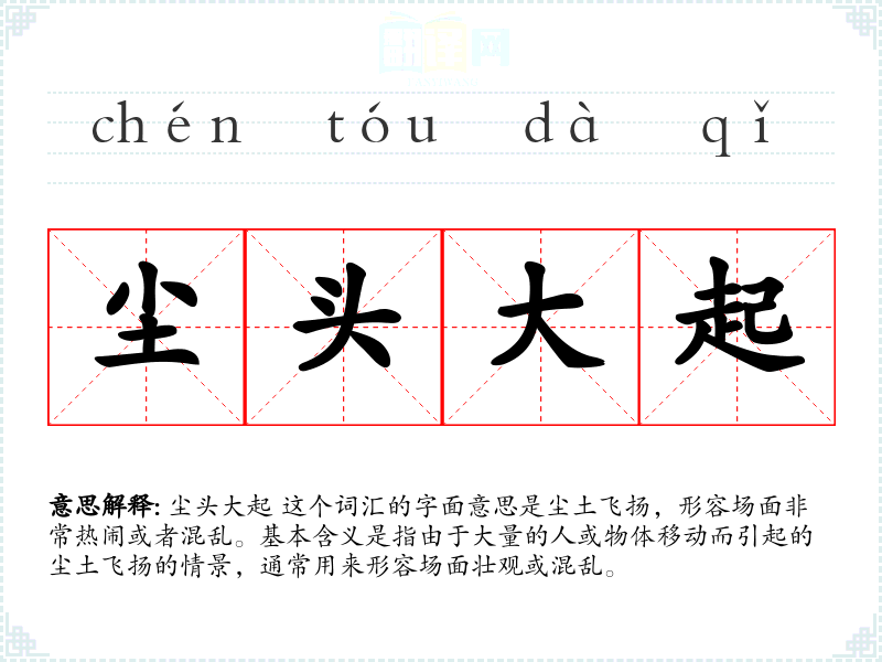 尘头大起 这个词汇的字面意思是尘土飞扬,形容场面非常热闹或者混乱。基本含义是指由于大量的人或物体移动而引起的尘土飞扬的情景,通常用来形容场面壮观或混乱。
