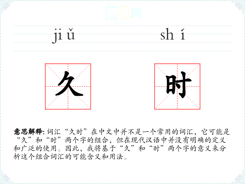 词汇“久时”在中文中并不是一个常用的词汇,它可能是“久”和“时”两个字的组合,但在现代汉语中并没有明确的定义和广泛的使用。因此,我将基于“久”和“时”两个字的意义来分析这个组合词汇的可能含义和用法。