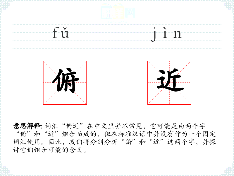 词汇“俯近”在中文里并不常见,它可能是由两个字“俯”和“近”组合而成的,但在标准汉语中并没有作为一个固定词汇使用。因此,我们将分别分析“俯”和“近”这两个字,并探讨它们组合可能的含义。