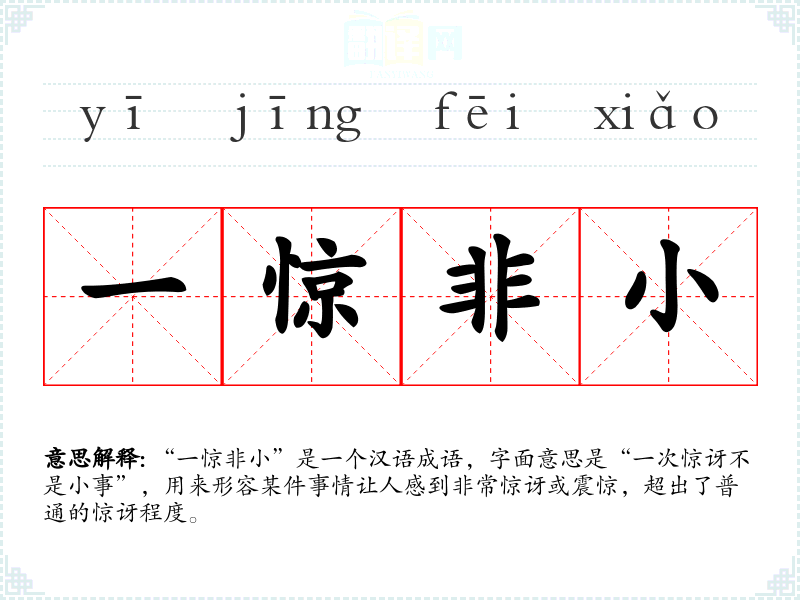 “一惊非小”是一个汉语成语,字面意思是“一次惊讶不是小事”,用来形容某件事情让人感到非常惊讶或震惊,超出了普通的惊讶程度。