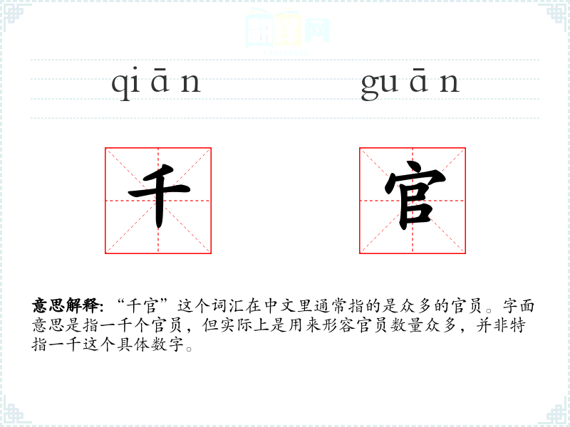 “千官”一词的词源较为直接,由“千”和“官”两个字组成。在古代汉语中,“千”常用来表示数量众多,而“官”指官员。随着时间的推移,这个词的含义基本保持不变,主要用于描述官员的数量。