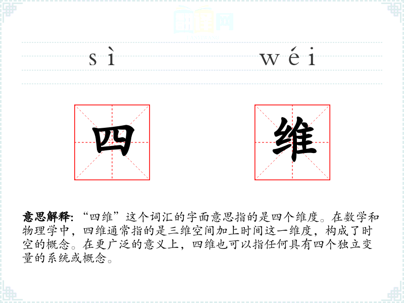 "四维"的意思解释、四维是什么意思由翻译网汉语词典查词提供。