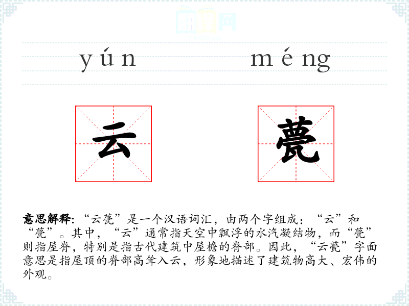 “云甍”是一个汉语词汇,由两个字组成:“云”和“甍”。其中,“云”通常指天空中飘浮的水汽凝结物,而“甍”则指屋脊,特别是指古代建筑中屋檐的脊部。因此,“云甍”字面意思是指屋顶的脊部高耸入云,形象地描述了建筑物高大、宏伟的外观。