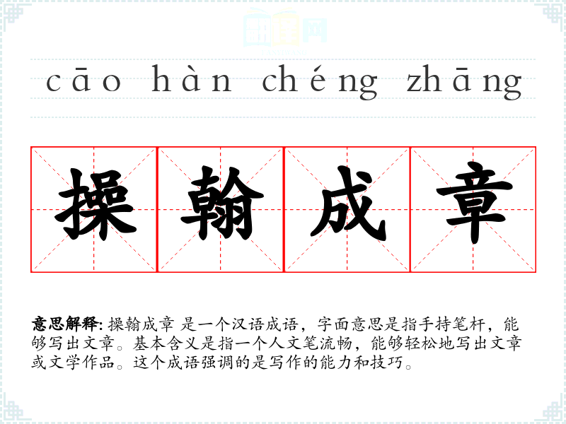 操翰成章 是一个汉语成语,字面意思是指手持笔杆,能够写出文章。基本含义是指一个人文笔流畅,能够轻松地写出文章或文学作品。这个成语强调的是写作的能力和技巧。