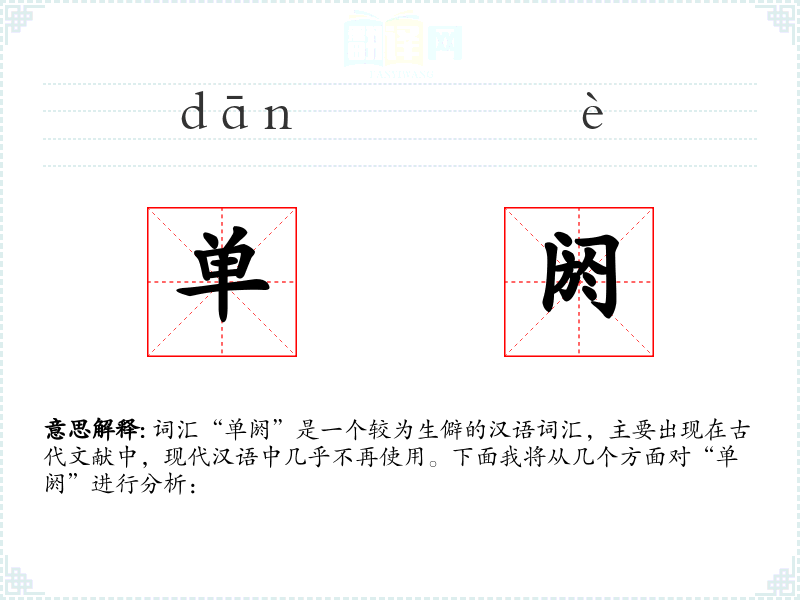 词汇“单阏”是一个较为生僻的汉语词汇,主要出现在古代文献中,现代汉语中几乎不再使用。下面我将从几个方面对“单阏”进行分析: