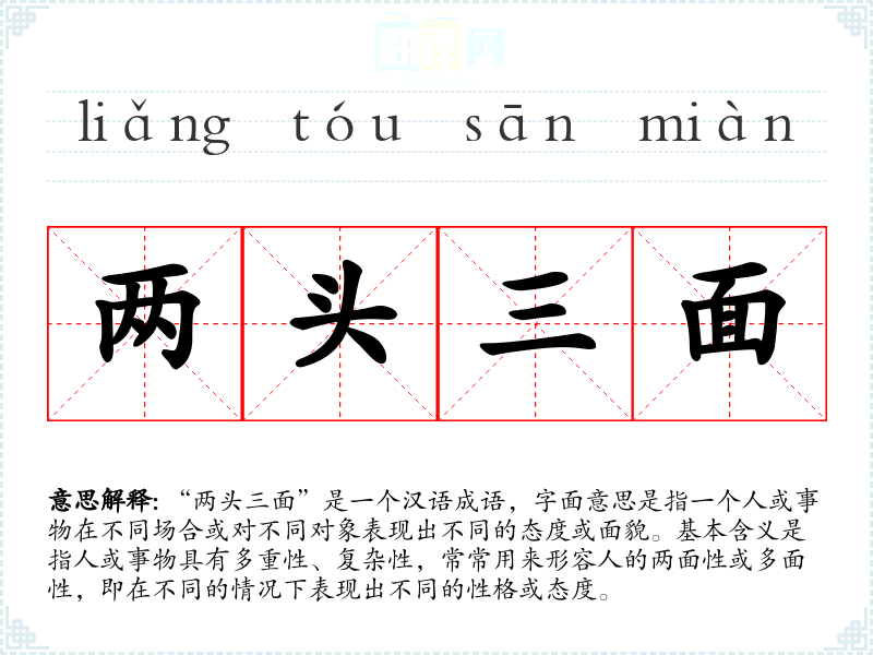 “两头三面”是一个汉语成语,字面意思是指一个人或事物在不同场合或对不同对象表现出不同的态度或面貌。基本含义是指人或事物具有多重性、复杂性,常常用来形容人的两面性或多面性,即在不同的情况下表现出不同的性格或态度。