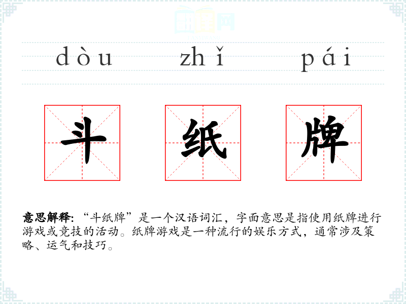 “斗”字在古代汉语中有争斗、比赛的意思,而“纸牌”则是指用纸制成的牌。这个词汇随着纸牌游戏的流行而逐渐被广泛使用。
