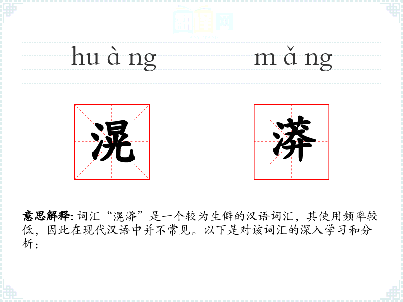 词汇“滉漭”是一个较为生僻的汉语词汇,其使用频率较低,因此在现代汉语中并不常见。以下是对该词汇的深入学*和分析: