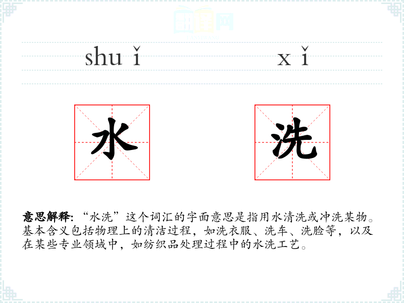 - 专业领域:在纺织和服装行业,“水洗”可能指特定的处理工艺,如水洗牛仔裤,以达到特定的磨损效果。