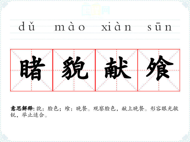 貌:脸色;飧:晚餐。观察脸色,献上晚餐。形容眼光敏锐,举止适合。