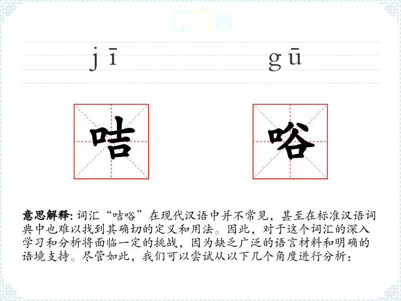 词汇“咭唂”在现代汉语中并不常见,甚至在标准汉语词典中也难以找到其确切的定义和用法。因此,对于这个词汇的深入学习和分析将面临一定的挑战,因为缺乏广泛的语言材料和明确的语境支持。尽管如此,我们可以尝试从以下几个角度进行分析: