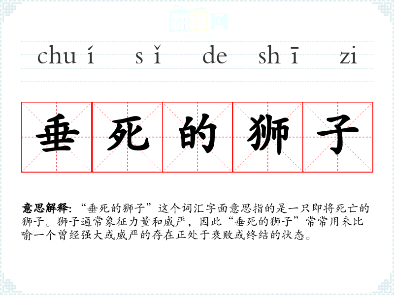 “垂死的狮子”这个词汇字面意思指的是一只即将死亡的狮子。狮子通常象征力量和威严,因此“垂死的狮子”常常用来比喻一个曾经强大或威严的存在正处于衰败或终结的状态。