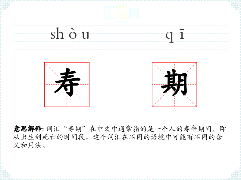 词汇“寿期”在中文中通常指的是一个人的寿命期间,即从出生到死亡的时间段。这个词汇在不同的语境中可能有不同的含义和用法。