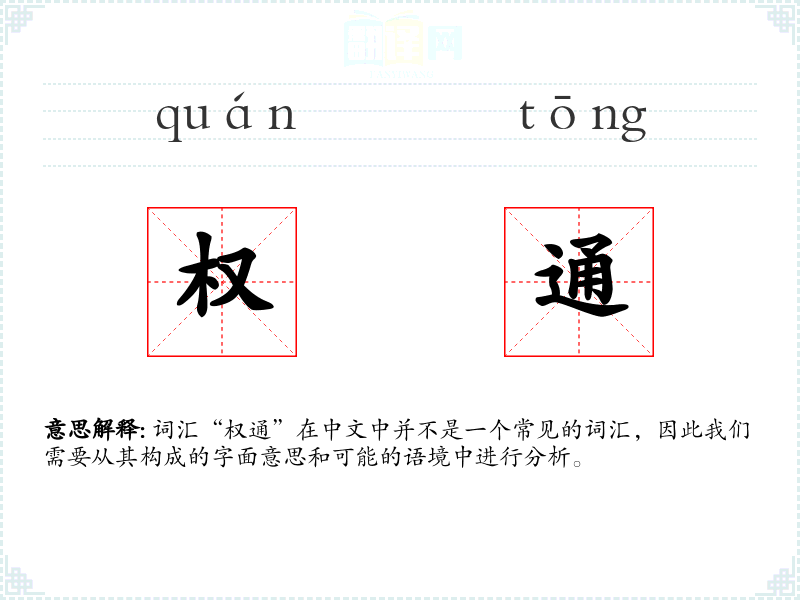 词汇“权通”在中文中并不是一个常见的词汇,因此我们需要从其构成的字面意思和可能的语境中进行分析。