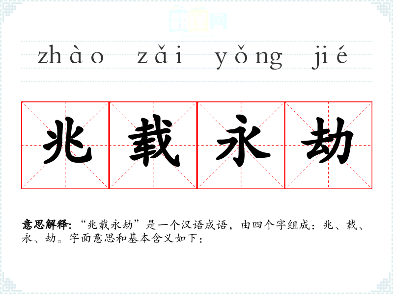“兆载永劫”是一个汉语成语,由四个字组成:兆、载、永、劫。字面意思和基本含义如下: