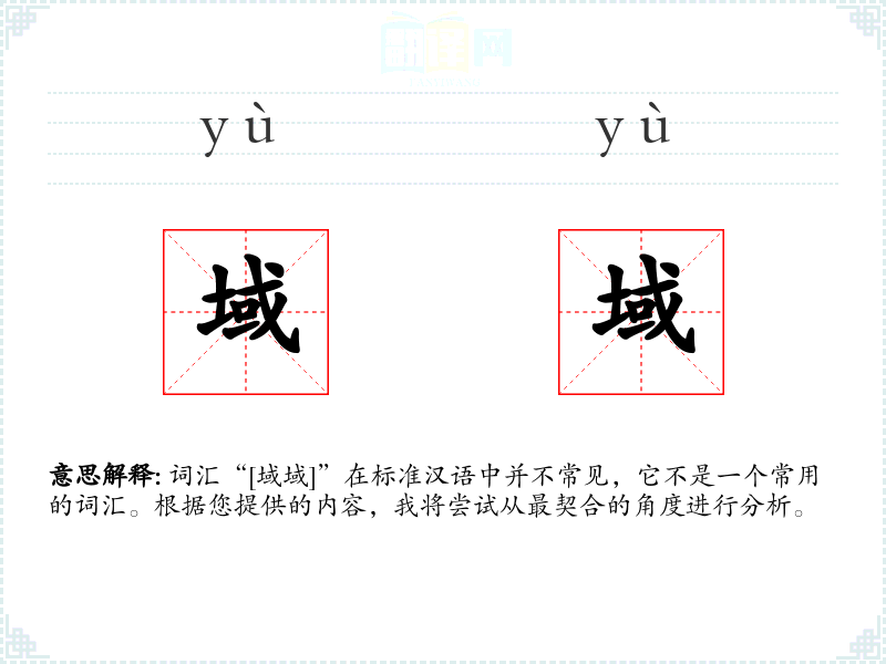 “域”字在古代汉语中就有使用,指的是一定的区域或范围。然而,“域域”作为一个重复的词汇,其使用和演变并不明确,可能更多是现代汉语中的创造性使用。