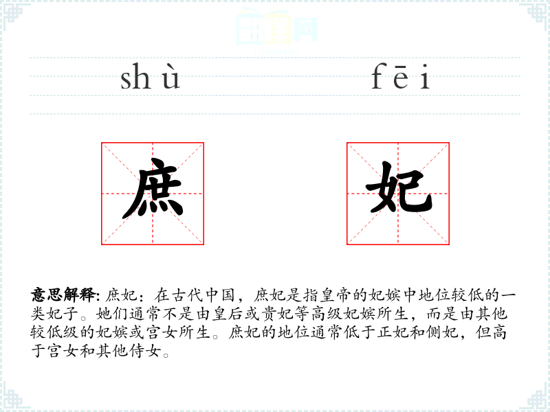 词源:庶妃一词源于古代汉语,“庶”字意为众多、非正统,“妃”字意为**的妃嫔。