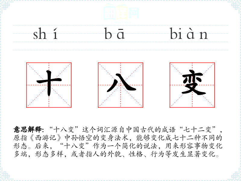 “十八变”源自“七十二变”,后者是《西游记》中孙悟空的特有法术。随着时间的推移,“十八变”被广泛用于形容各种变化,成为了一个常用的成语。
