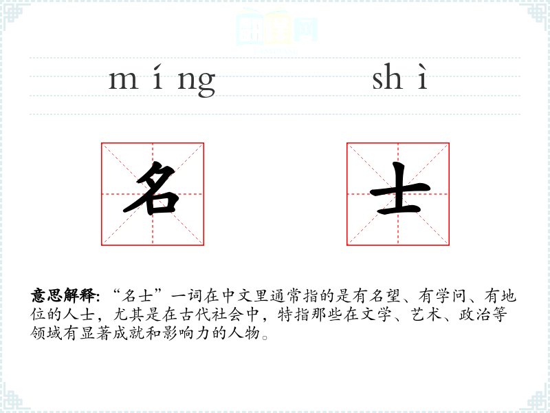 “名士”一词在中文里通常指的是有名望、有学问、有地位的人士,尤其是在古代社会中,特指那些在文学、艺术、政治等领域有显著成就和影响力的人物。