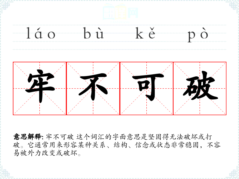 "牢不可破" 这个词汇源自汉语,"牢" 指坚固,"不可破" 指无法被打破。在古代文献中已有使用,如《左传》中有 "牢不可破" 的用法,形容坚固不可摧毁。