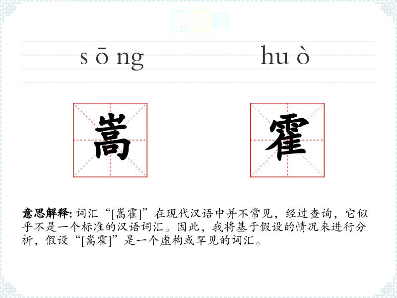 词汇“[嵩霍]”在现代汉语中并不常见,经过查询,它似乎不是一个标准的汉语词汇。因此,我将基于假设的情况来进行分析,假设“[嵩霍]”是一个虚构或罕见的词汇。