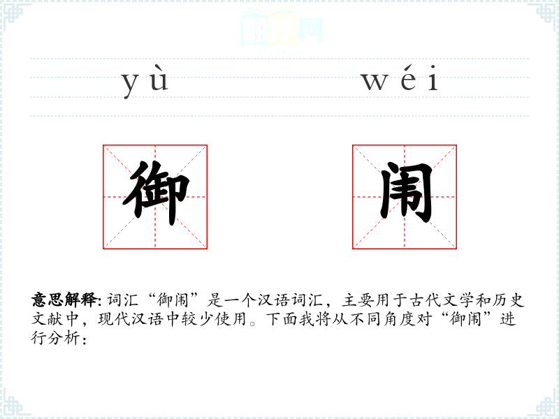 词汇“御闱”是一个汉语词汇,主要用于古代文学和历史文献中,现代汉语中较少使用。下面我将从不同角度对“御闱”进行分析: