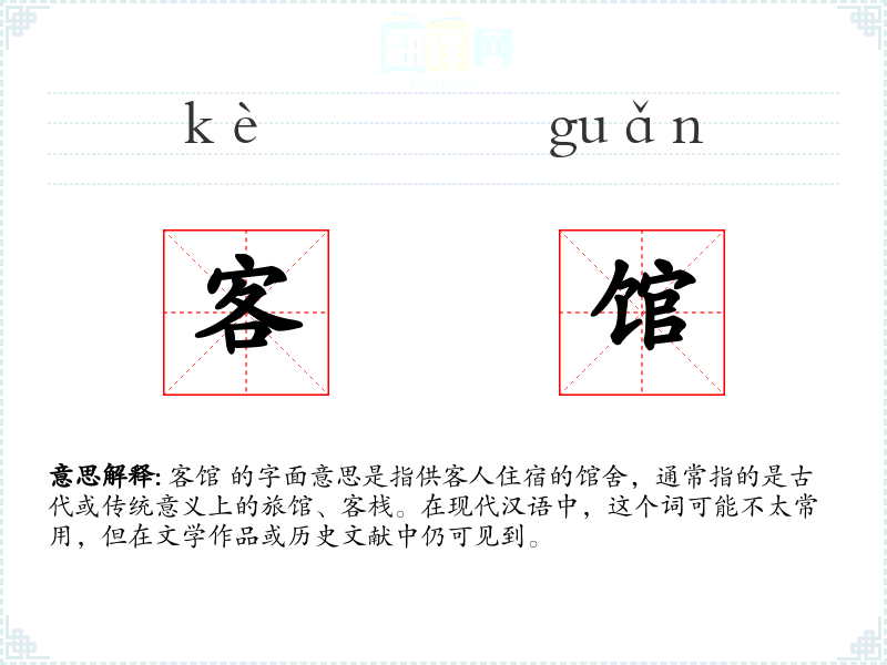 - 专业领域:在旅游或酒店管理领域,“客馆”可能被用来指代具有特定文化或历史背景的住宿设施。
