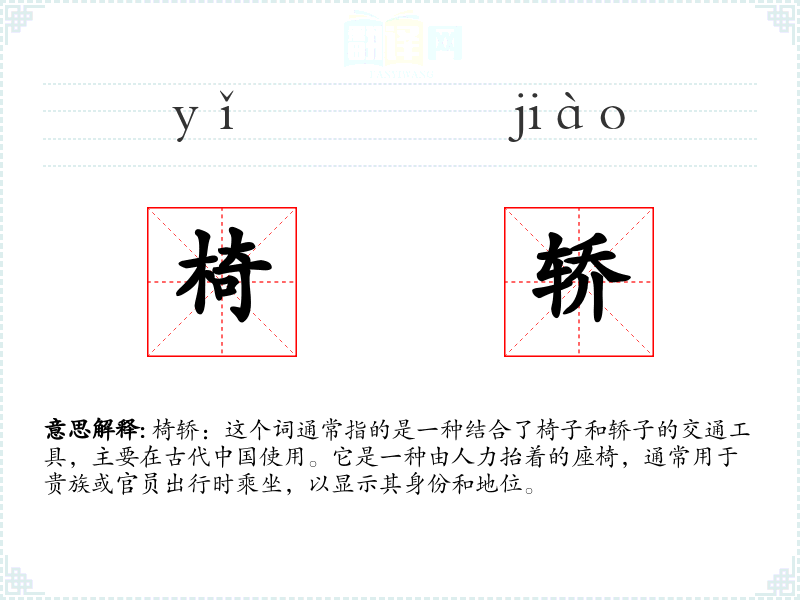 通过对“椅轿”的学*和分析,我更加深入地理解了它在古代**社会中的意义和作用。这个词不仅代表了交通工具,更是文化和历史的载体,对于理解古代社会结构和生活方式具有重要意义。