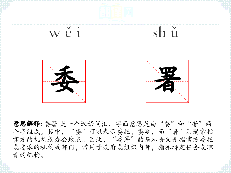 委署 是一个汉语词汇,字面意思是由“委”和“署”两个字组成。其中,“委”可以表示委托、委派,而“署”则通常指官方的机构或办公地点。因此,“委署”的基本含义是指官方委托或委派的机构或部门,常用于政府或组织内部,指派特定任务或职责的机构。