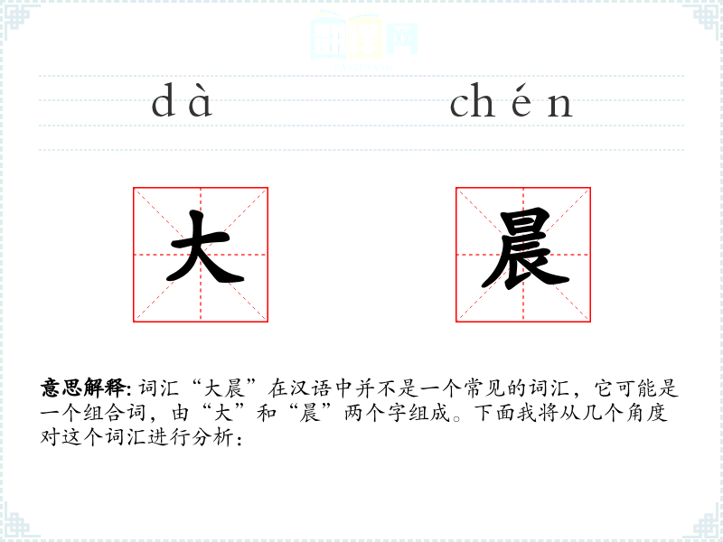 词汇“大晨”在汉语中并不是一个常见的词汇,它可能是一个组合词,由“大”和“晨”两个字组成。下面我将从几个角度对这个词汇进行分析: