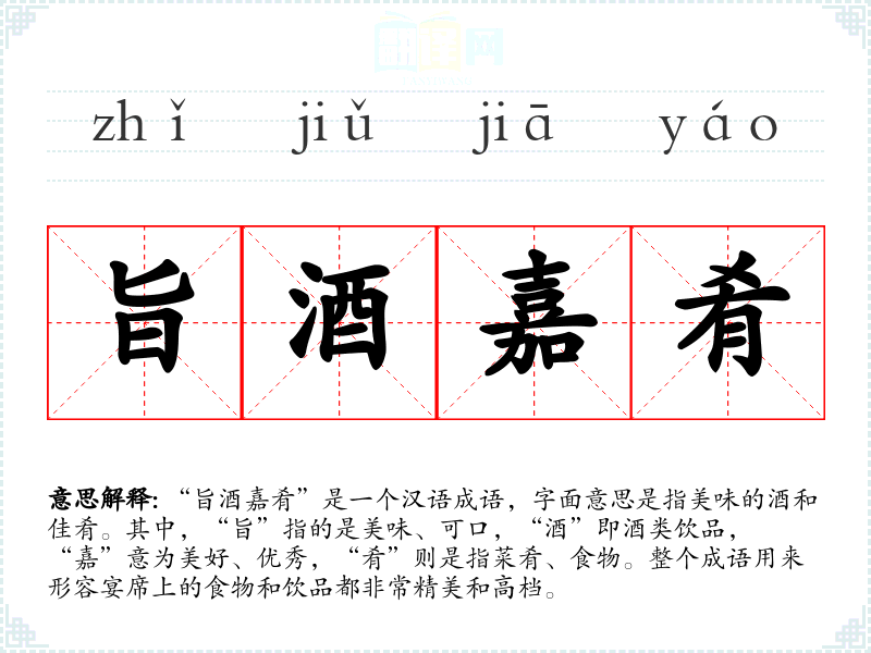 在文学作品中,“旨酒嘉肴”常用来描绘宴会的盛况,表达对美食美酒的赞美。在口语中,这个成语可能不常直接使用,但类似的表达如“美味佳肴”则更为常见。在专业领域,如餐饮业或烹饪艺术中,这个词汇可能会被用来描述高端的餐饮体验。