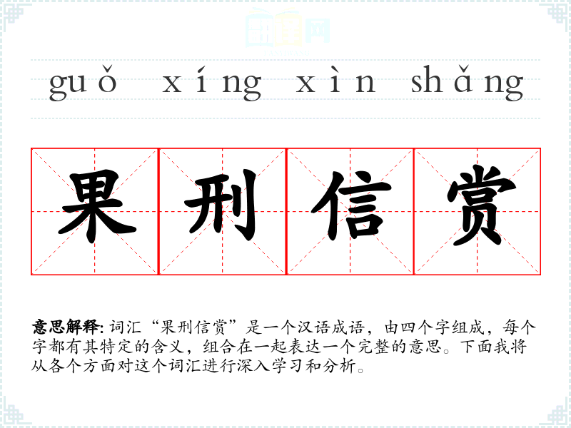 词汇“果刑信赏”是一个汉语成语,由四个字组成,每个字都有其特定的含义,组合在一起表达一个完整的意思。下面我将从各个方面对这个词汇进行深入学*和分析。