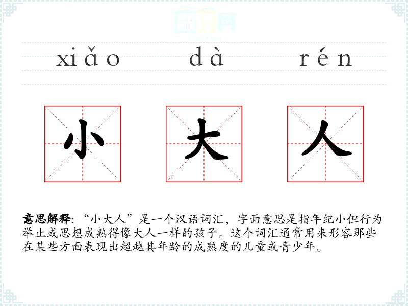 “小大人”是一个汉语词汇,字面意思是指年纪小但行为举止或思想成熟得像大人一样的孩子。这个词汇通常用来形容那些在某些方面表现出超越其年龄的成熟度的儿童或青少年。