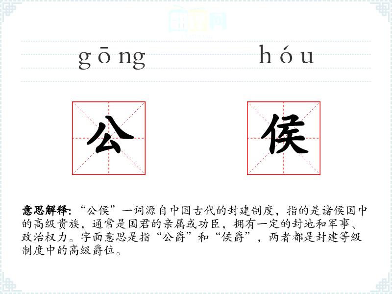“公侯”一词源自**古代的封建制度,指的是诸侯国中的高级贵族,通常是国君的亲属或功臣,拥有一定的封地和军事、政治权力。字面意思是指“公爵”和“侯爵”,两者都是封建等级制度中的高级爵位。