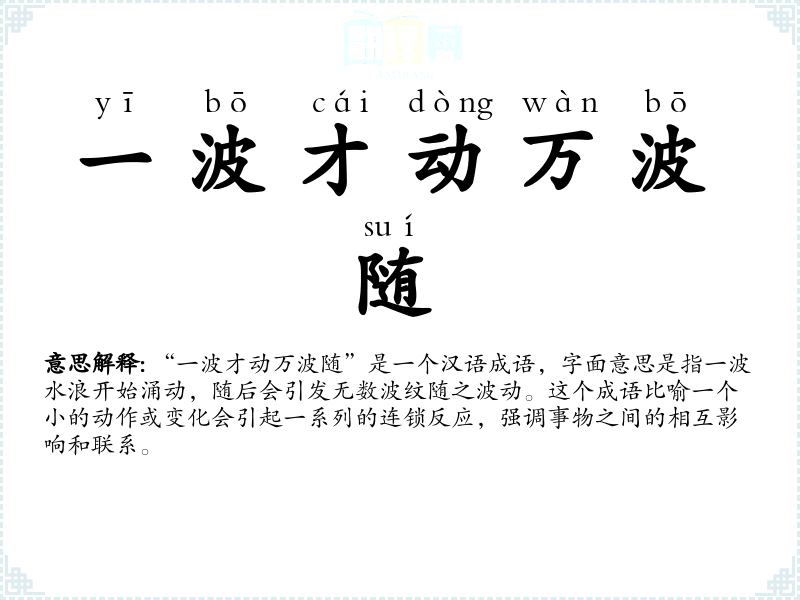 “一波才动万波随”是一个汉语成语,字面意思是指一波水浪开始涌动,随后会引发无数波纹随之波动。这个成语比喻一个小的动作或变化会引起一系列的连锁反应,强调事物之间的相互影响和联系。