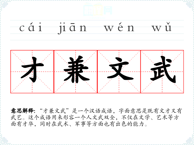 “才兼文武”是一个汉语成语,字面意思是既有文才又有武艺。这个成语用来形容一个人文武双全,不仅在文学、艺术等方面有才华,同时在武术、军事等方面也有出色的能力。