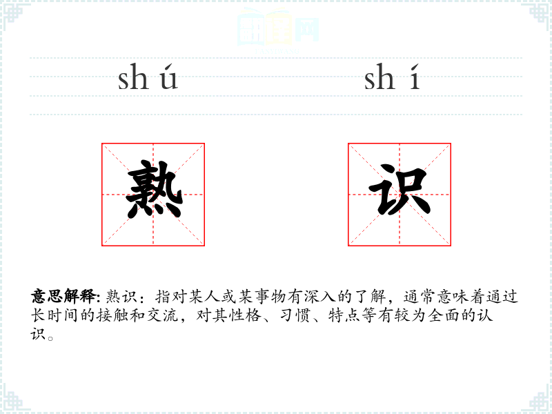 熟识:指对某人或某事物有深入的了解,通常意味着通过长时间的接触和交流,对其性格、*惯、特点等有较为全面的认识。