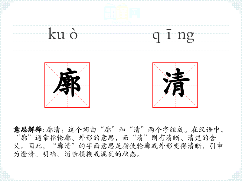 廓清:这个词由“廓”和“清”两个字组成。在汉语中,“廓”通常指轮廓、外形的意思,而“清”则有清晰、清楚的含义。因此,“廓清”的字面意思是指使轮廓或外形变得清晰,引申为澄清、明确、消除模糊或混乱的状态。