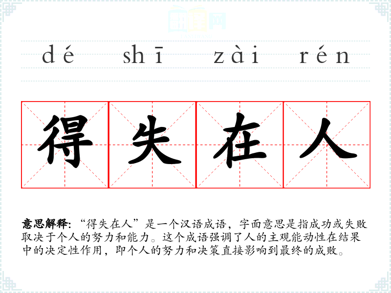 “得失在人”是一个汉语成语,字面意思是指成功或失败取决于个人的努力和能力。这个成语强调了人的主观能动性在结果中的决定性作用,即个人的努力和决策直接影响到最终的成败。