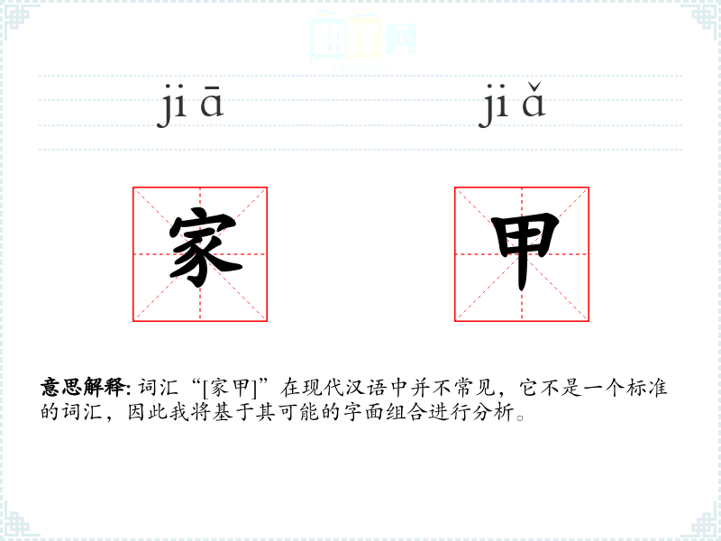 词汇“[家甲]”在现代汉语中并不常见,它不是一个标准的词汇,因此我将基于其可能的字面组合进行分析。