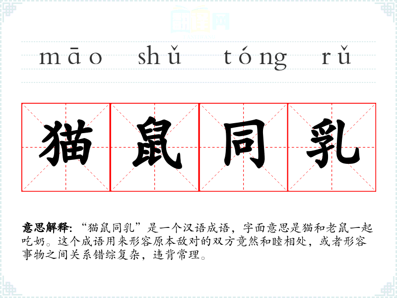 “猫鼠同乳”是一个汉语成语,字面意思是猫和老鼠一起吃奶。这个成语用来形容原本敌对的双方竟然和睦相处,或者形容事物之间关系错综复杂,违背常理。