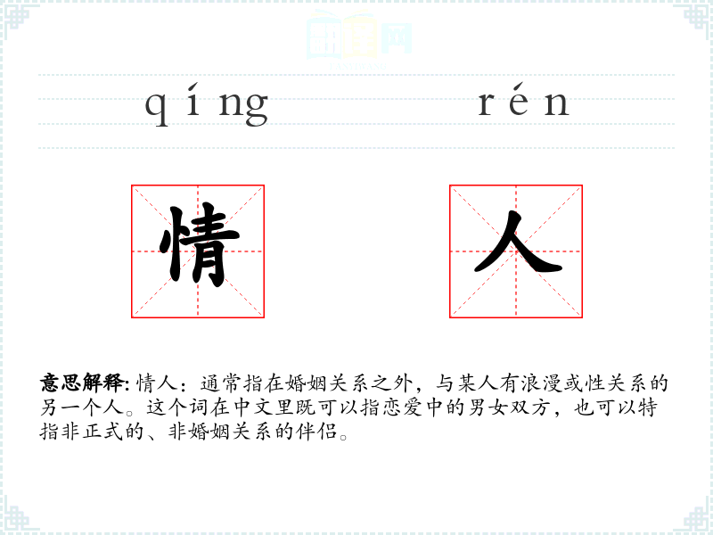 情人:通常指在婚姻关系之外,与某人有浪漫或性关系的另一个人。这个词在中文里既可以指恋爱中的男女双方,也可以特指非正式的、非婚姻关系的伴侣。