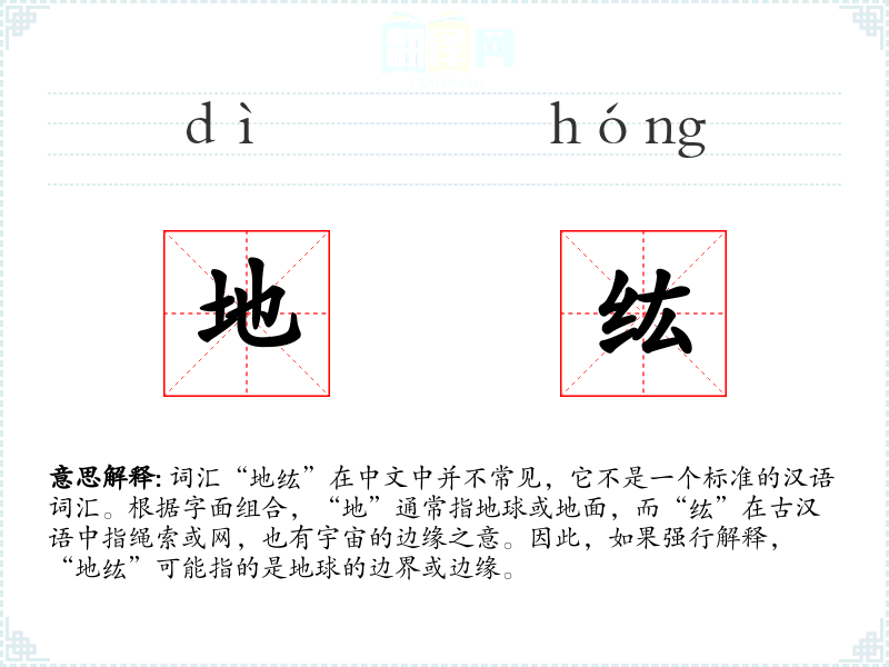 词汇“地纮”在中文中并不常见,它不是一个标准的汉语词汇。根据字面组合,“地”通常指地球或地面,而“纮”在古汉语中指绳索或网,也有宇宙的边缘之意。因此,如果强行解释,“地纮”可能指的是地球的边界或边缘。