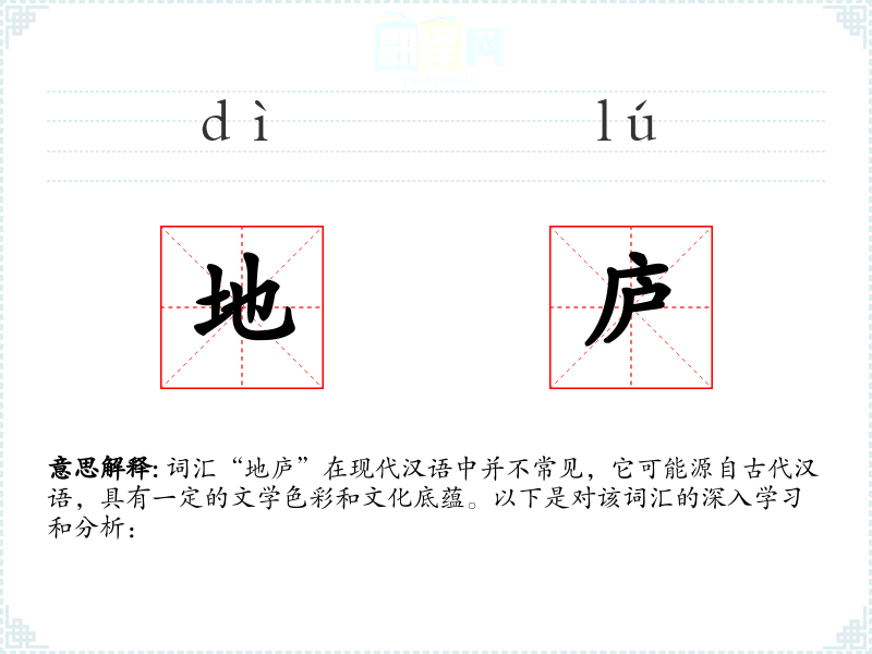 词汇“地庐”在现代汉语中并不常见,它可能源自古代汉语,具有一定的文学色彩和文化底蕴。以下是对该词汇的深入学*和分析: