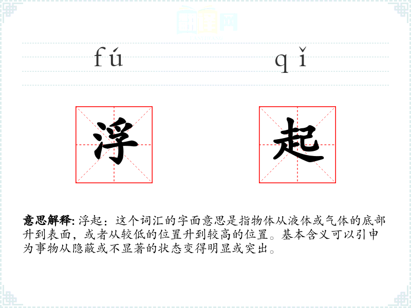 浮起:这个词汇的字面意思是指物体从液体或气体的底部升到表面,或者从较低的位置升到较高的位置。基本含义可以引申为事物从隐蔽或不显著的状态变得明显或突出。